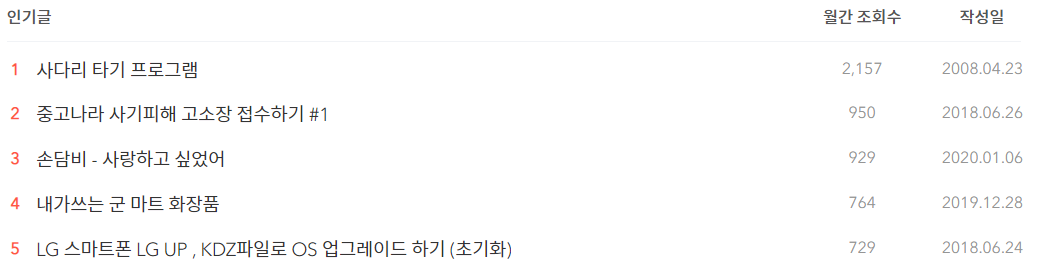역시 인기글은 '사다리 타기 프로그램' 이 독보적인 1위고 (2008년 포스트의 위엄), 2위는 중고나라 사기 피해 고소장 접수 , 3위가 의외였는데 알고보니 얼마전에 나혼자 산다에 손담비가 나왔었는데 거기에 나온 BGM이 바로 저 노래였다고 한다. 하긴 노래가 워낙 괜찮았음. 4위는 역시 군마트 화장품 ㅋㅋ, 5위는 LG폰 OS업그레이드 방법.