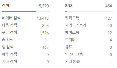 검색은 역시 네이버가 압도적이고, 그 다음 구글 , 다음, 빙, 줌 순이다. 의외로 구글에서도 검색이 많이 되나 보다. SNS에서 카카오톡으로 검색해서 들어오는건 뭘까??? -_-?