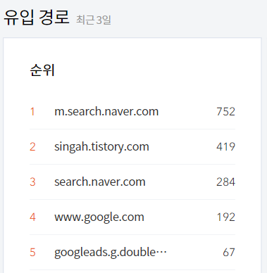 유입은 역시 네이버 검색으로 가장 많이 들어오고, 2순위가 왜 내 블로그지?? 내 블로그 내에서 검색하는건가?? -__-? 5순위는 구글 광고 클릭해서 들어오는 것 같다. 구글광고 누르는 사람이 있긴 있구나.