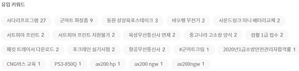 유입키워드는 '사다리프로그램' 이 1위다. 이거 내가 만든 프로그램도 아니고 어디서 다운 받아서 올려둔건데 의외로 많이 찾는것 같다. 군마트 화장품은 워낙 저렴하고 품질 좋기로 유명해서 유입이 잘되는것 같고, 나머지는 다 고만고만 한 걸로 유입이 되는 것 같다. 낚시성글을 올리면 유입이 잘 될테지만, 내 블로그는 고품질 일상 잡 블로그 인지라 낚시글은 적지 않으련다.