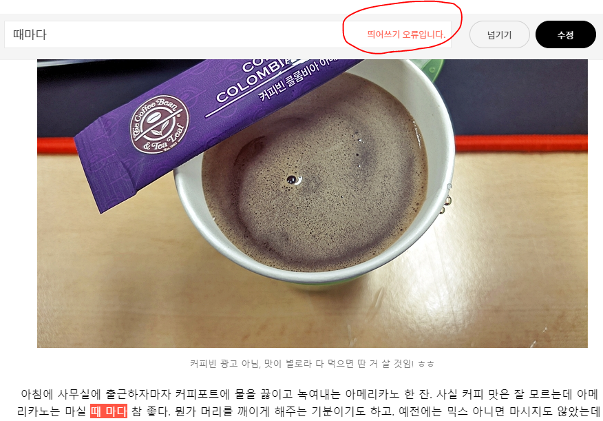 맞춤법 검사를 누르면 저렇게 잘못 구성된 단어를 체크해주고 무엇이 오류인지 알려준 후, 옆에 수정을 누르면 바로 치환해준다. 나 같은 경우 맞춤법에 민감한 편이라 전에는 한글(HWP) 프로그램 띄워서 글 쓴 후 F11 눌러서 맞춤법 검사를 하고 다시 복사> 붙여 넣기 해서 포스팅을 작성하곤 했는데, 이젠 그러지 않아도 되는 것 같아서 좋다.
