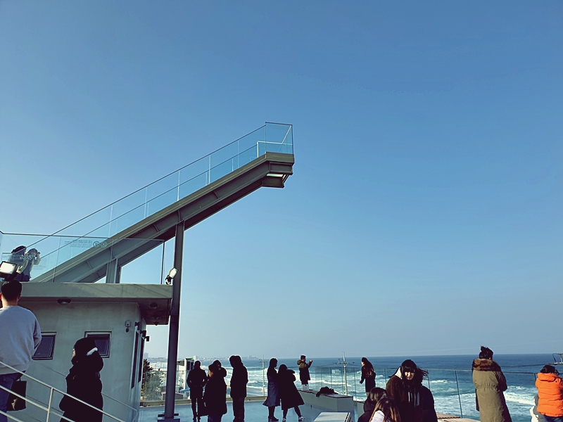 사천해변의 명물(?) 이라 줄이 참 길었다. 난 그냥 이 사진 찍는 걸로 만족. 옥상에도 벤치가 마련되어 있어서 바람만 안 분다면 이곳에 나와서 바다 보며 차 한잔 나눠도 참 좋을 것 같다는 생각을 했다.