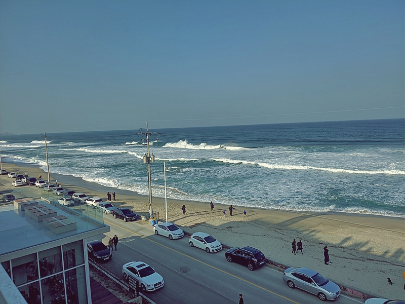강릉 날씨가 갑자기 무척이나 좋아진 관계로, 이런 날에 집에 있는 것은 인생낭비라고 생각해서 해변 구경을 나갔다. 동료들이 추천해준 사천해변에 있는 '곳;카페'라는 곳으로 20여분을 달려서 도착했는데 와~ 오길 잘했다. 싶다. 바람이 많이 불어서 춥긴 했지만 높은 곳에서 푸른 동해바다를 보니 가슴이 뻥~ 하고 뚫리는 기분이 들어서 참 좋았더랬다.