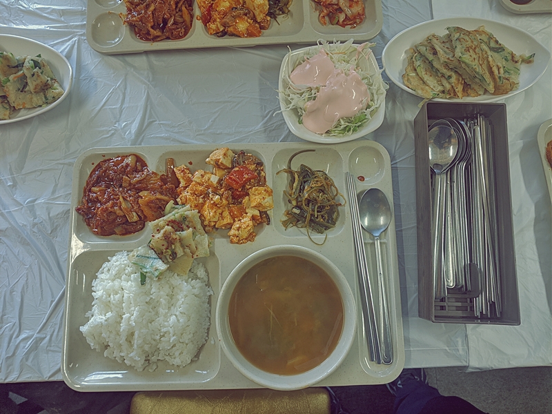 볶음김치 + 마파두부 + 부침개 + 미역줄기 볶음 + 된장국 + 양배추샐러드 + 백미