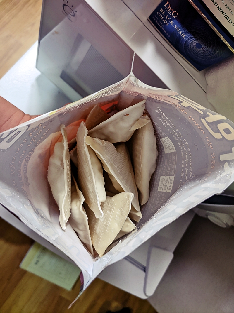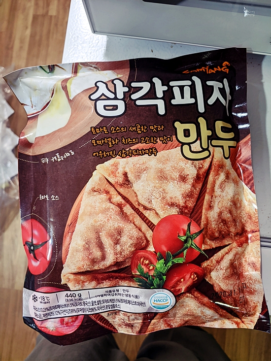 간단히(?) 먹기로하고 냉동고에 잠들어 있던 삼각피자만두를 꺼내서 전자렌지에 돌리기 시작했다.