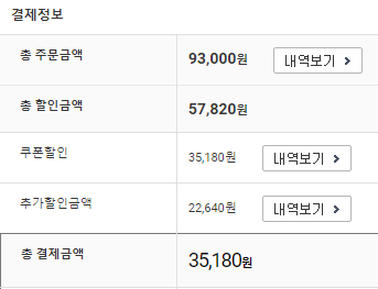 추가 할인 22,640원에 거기다가 신규가입 50% 할인 쿠폰 썼더니 35,180원으로 결제