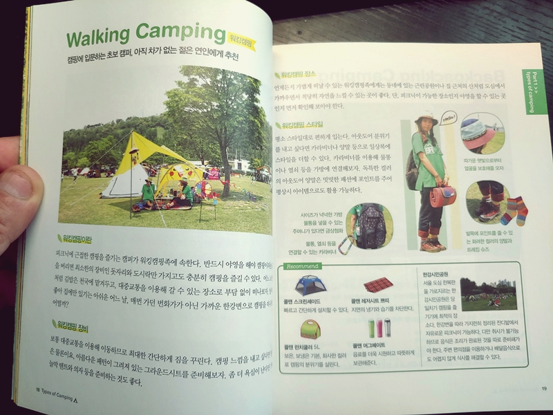 어찌되었든 내 손안에 들어온 캠핑 책 한권. 정말 캠핑에 문외한인 사람들에게 용도별 캠핑용품들 (피크닉, 1인 캠핑, 다인 캠핑 등)을 분류해놨는데, 나 같은경우 거의 피크닉 수준의 캠핑을 하는지라 관련 필요 용품들과 그 용품들에 대한 설명등을 적어놔서 참 좋았더랬다.