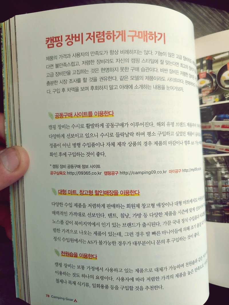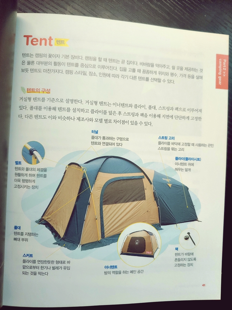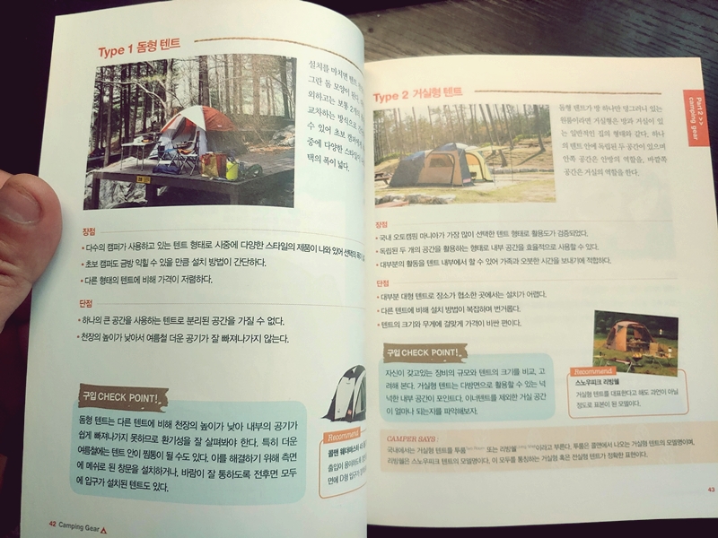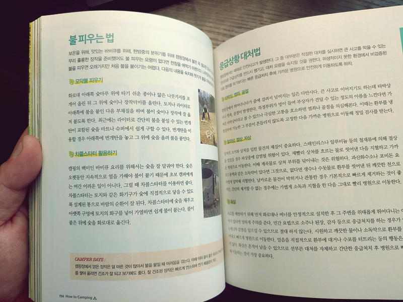 최근에 캠핑에 관한 관심이 많아져서 나도 캠핑을 좀 해볼까? 라는 생각으로 책을 구매를 했다. 인터넷과 유튜브에도 널려있는 자료라지만, 아날로그 감성이 앞서는 나는 아직까지 이렇게 활자로 정리된 것을 손으로 넘겨가며 읽어야 머리에 더 잘 들어오는지라, 책으로 읽기로 했다.
