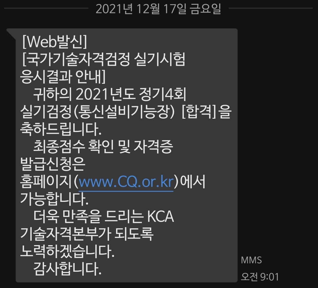 9시 조금 넘자 문자로 합격통보가 왔다.