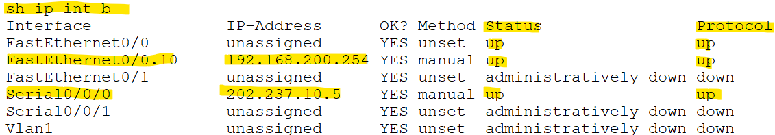 항상 모든 명령어 입력후 sh ip int b 명령으로 인터페이스들에 ip가 제대로 들어갔는지와 Status 와 Protocol이 up으로되어 있는지 확인해야 한다.