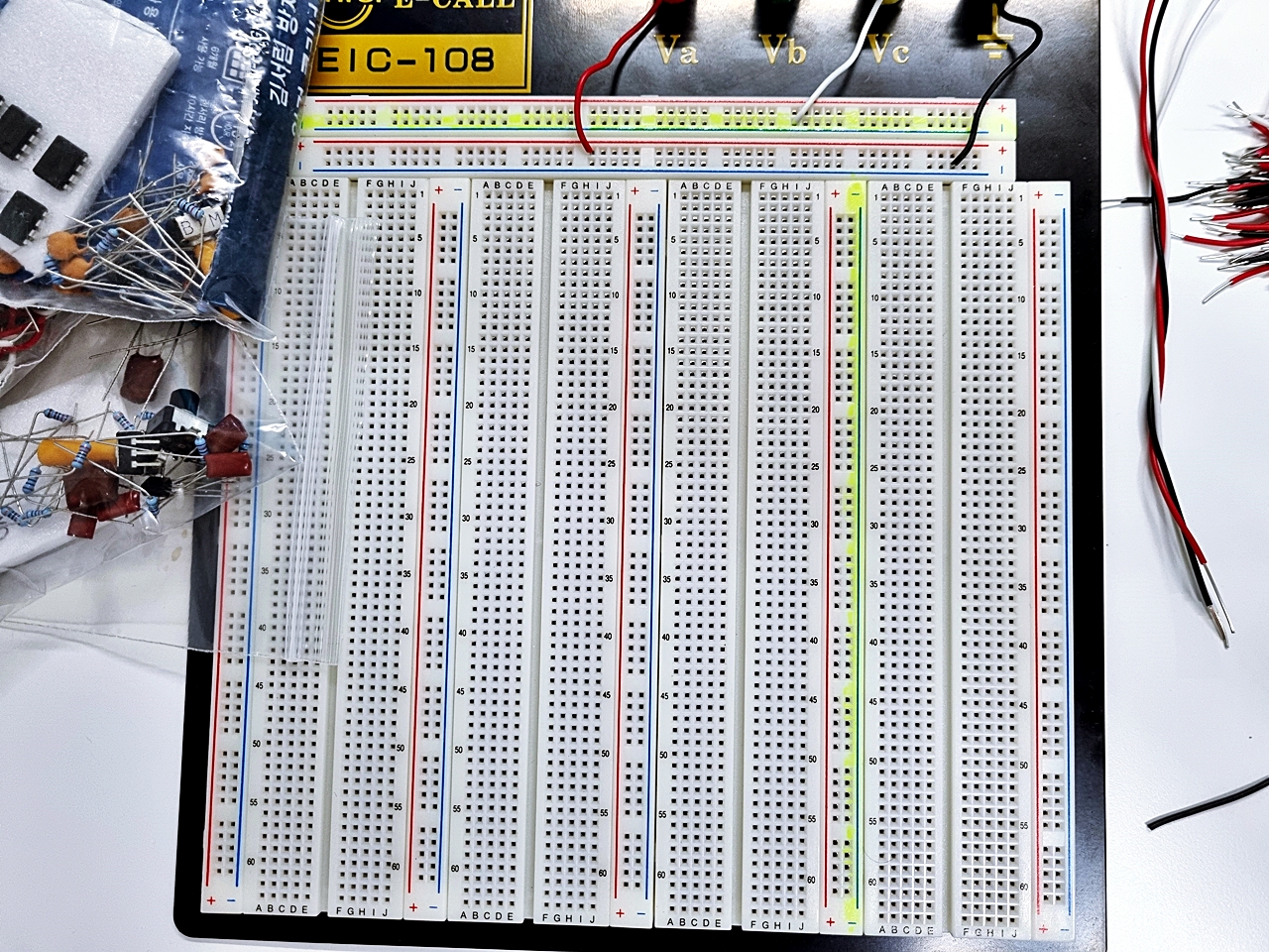 1. 브레드보드 (빵판)에 -VCC를 넣을곳에 형관펜으로 칠해두기.