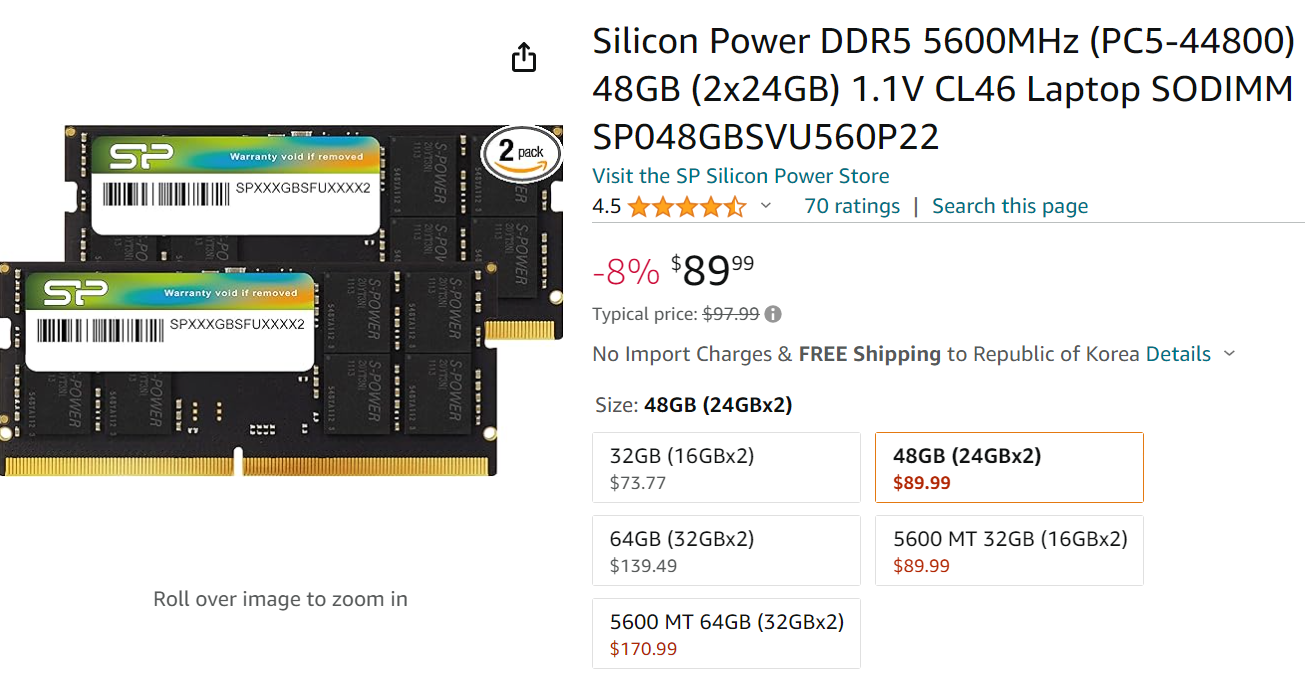 새로 구입한 SER8 미니PC에 장착해줄 요량으로 아마존에서 노트북램을 구입했다.