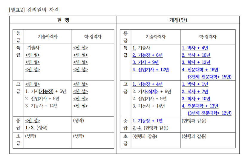 특히 특급의 경우 기술사만 가능했으나, 이번 개정으로 자격+경력 또는 학력+경력으로 특급을 받을수 있게 되었다.