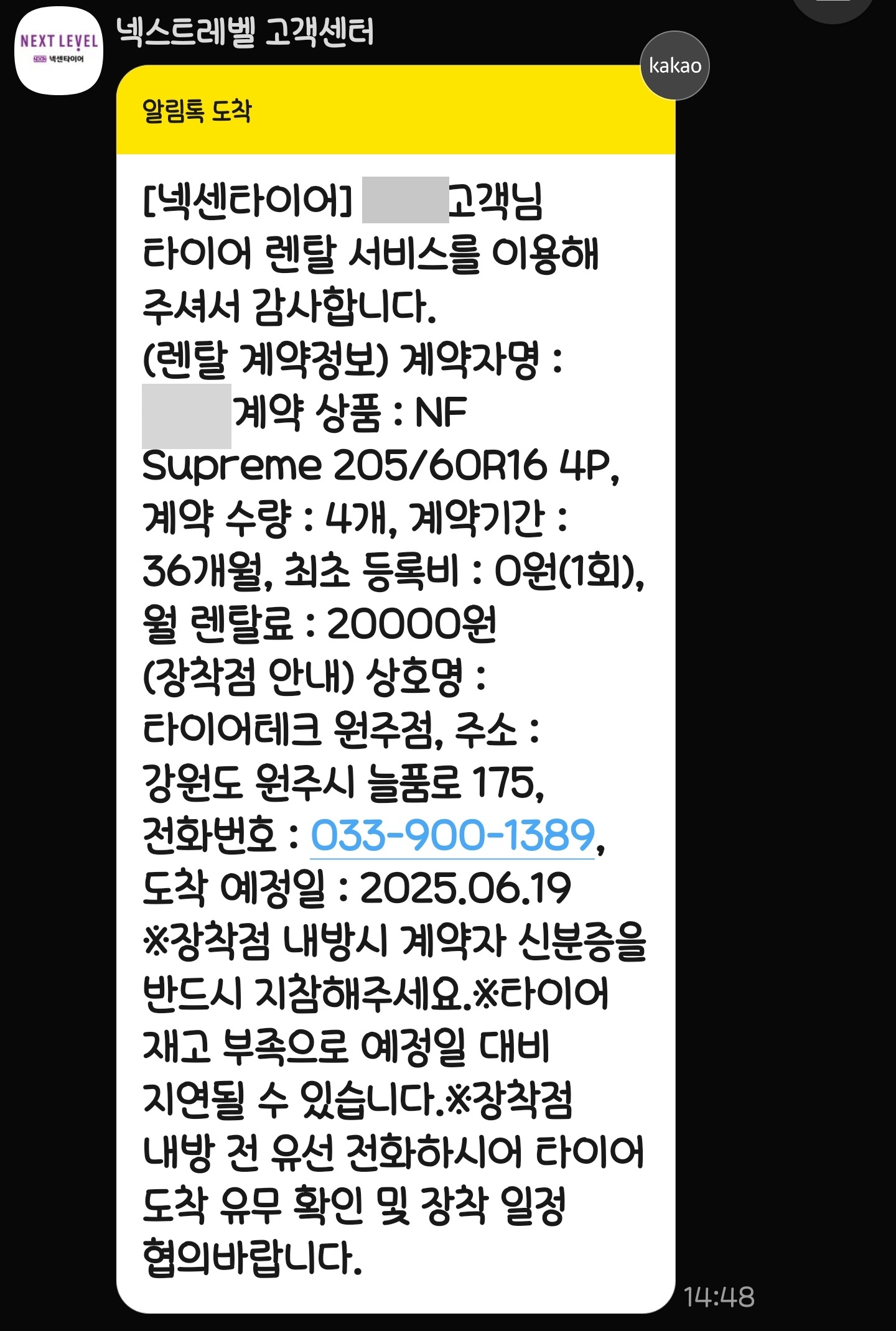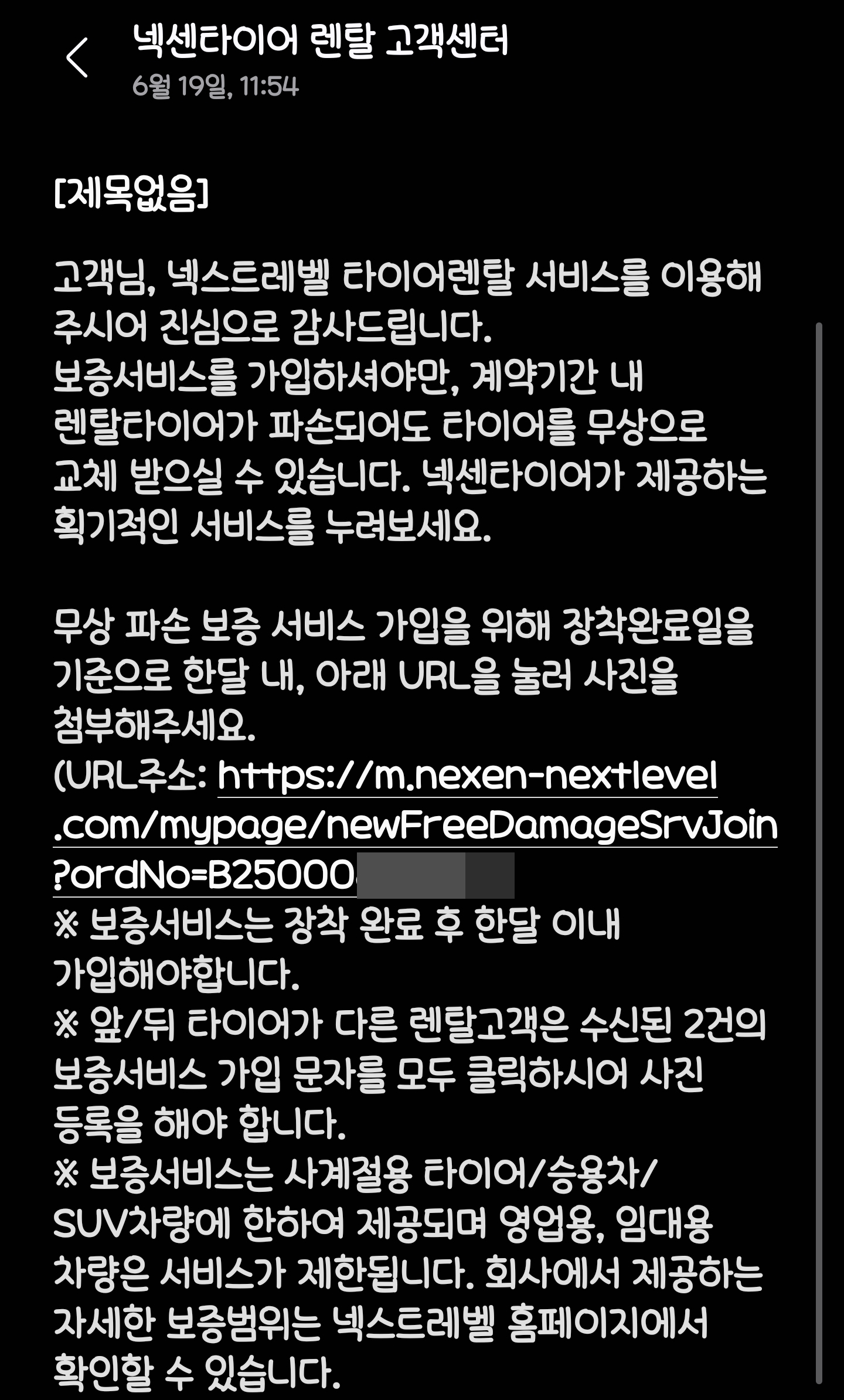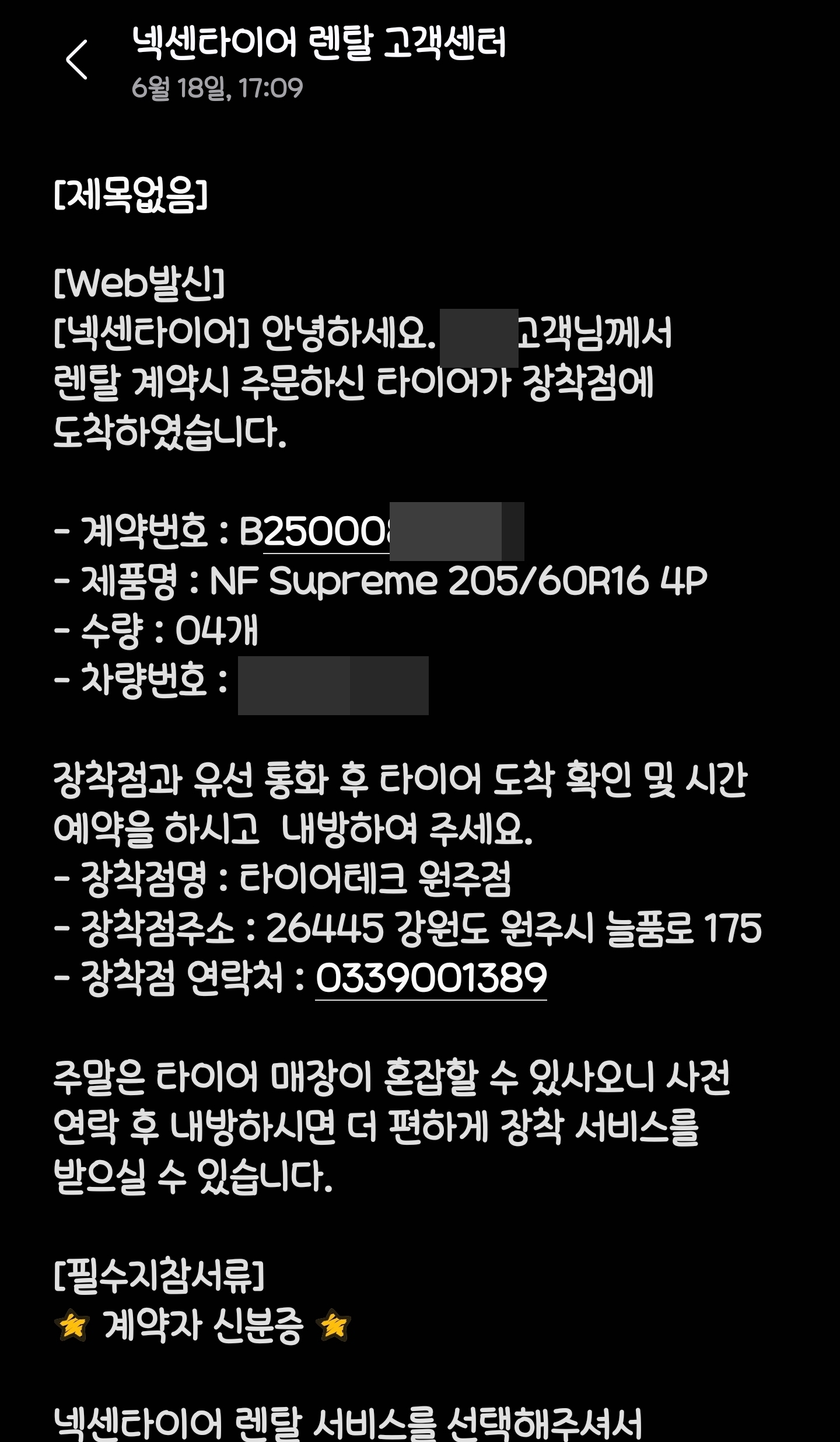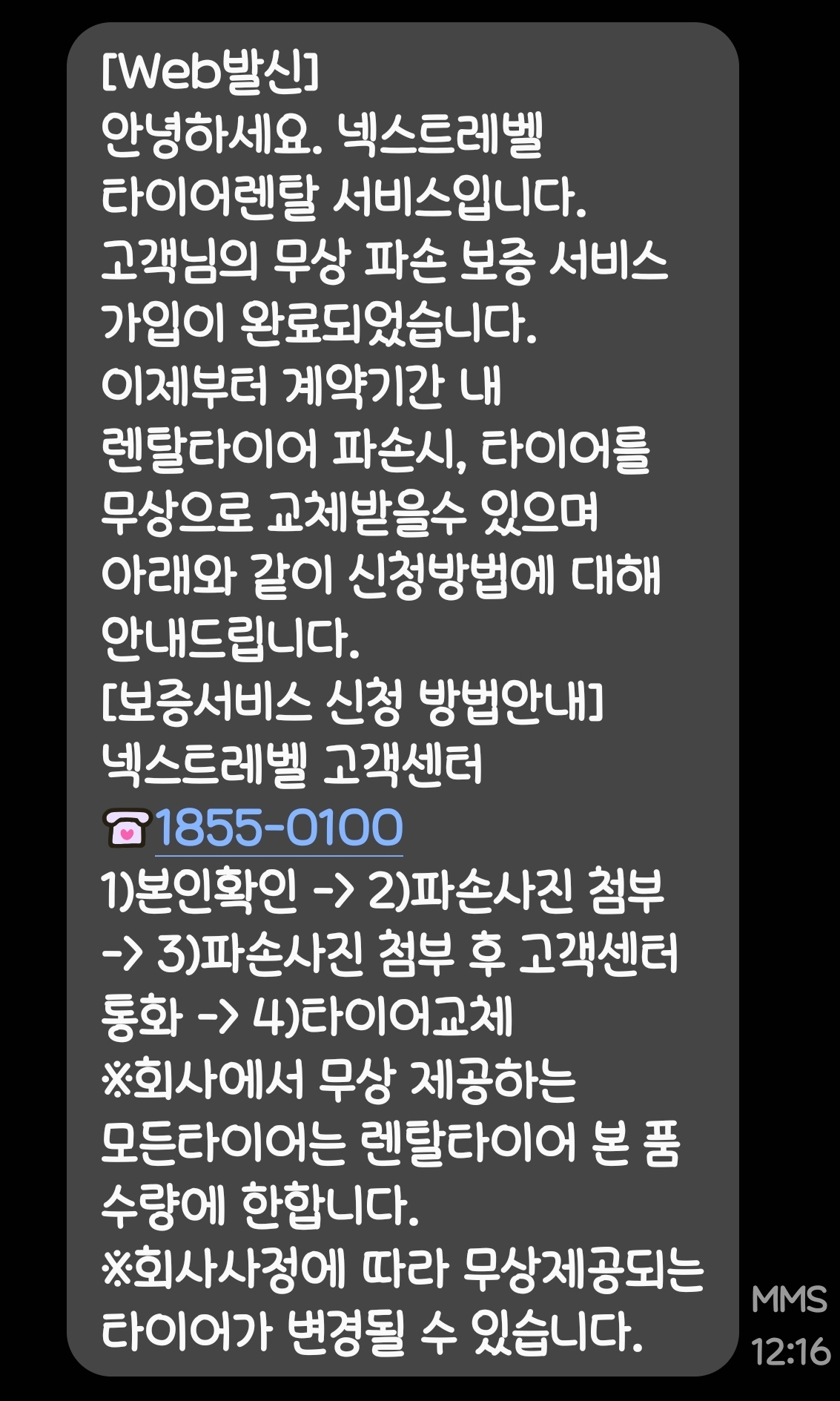 인증점 홈페이지에서 간단한 렌탈 신청 정보를 넣고 기다리면, 넥센타이어 렌탈 측에서 직접 해피콜을 해준다. * 협약인증점 추가 상품권은 장착하고 한 달 있다가 모바일로 발송해준다고 함.