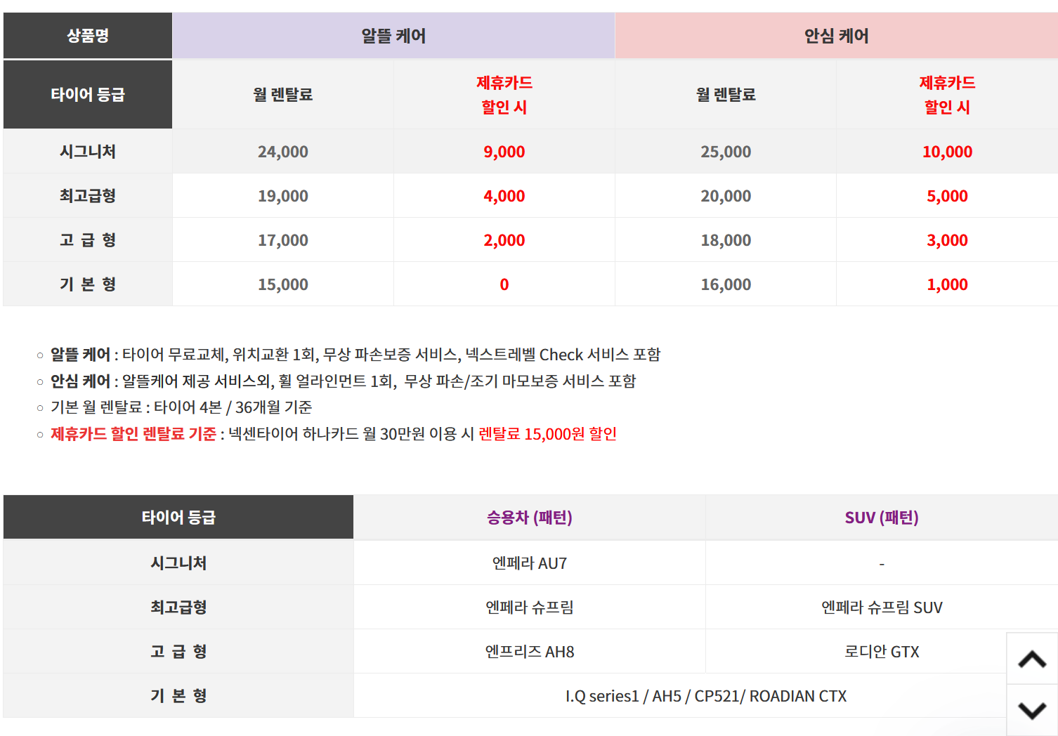 예를들어 내 차량에 들어가는 엔페라 슈프림의 경우 4본 안심케어 요금제로 36개월 약정
