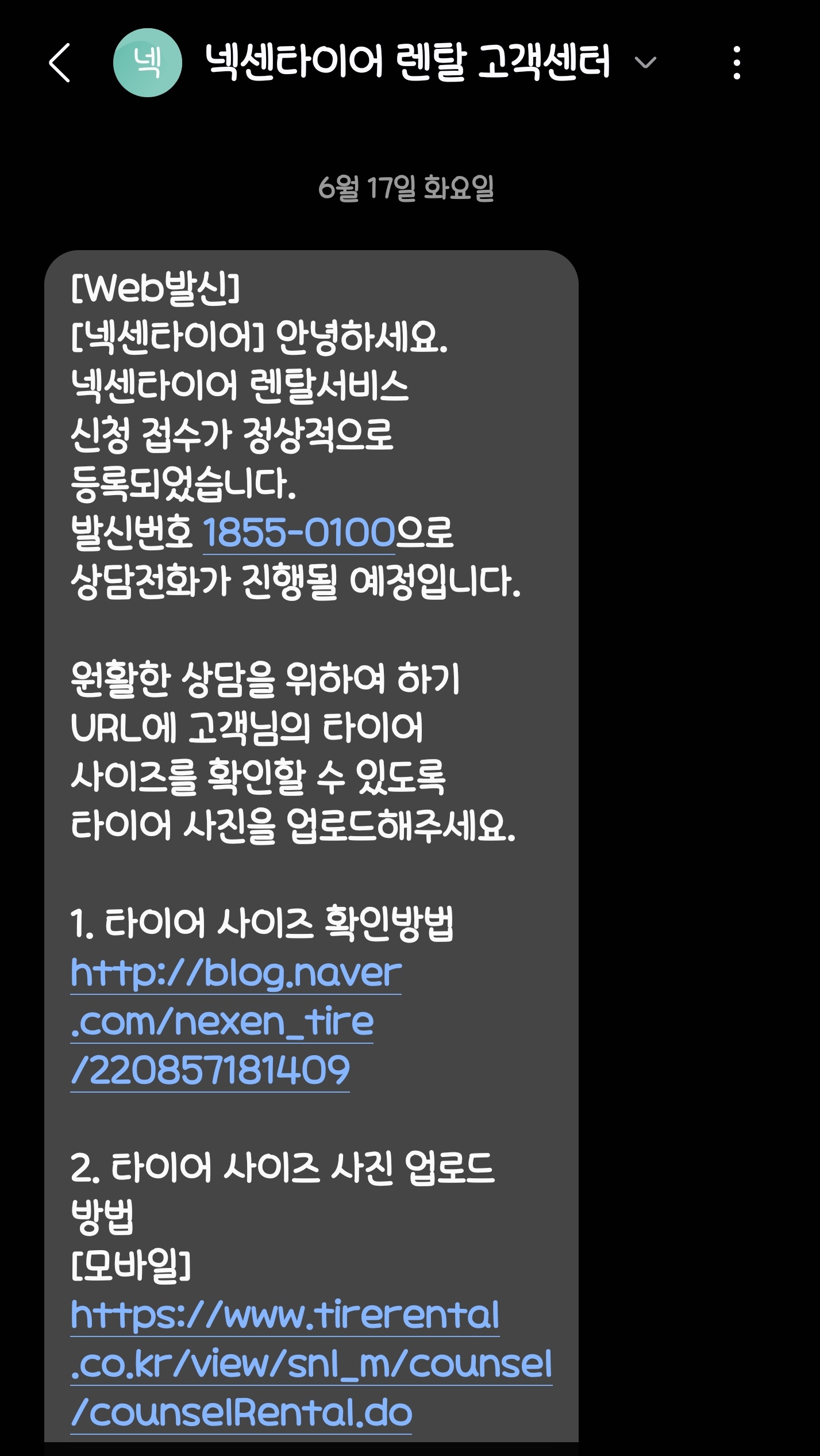 이렇게 렌탈할 타이어 까지 선정 후 상담신청을 하면 금새 확인 문자가 온다.