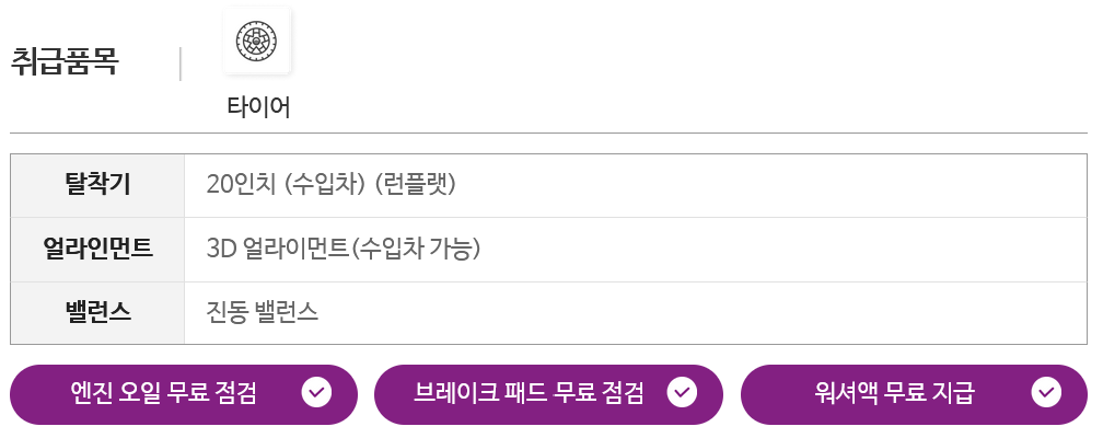 취급품목은 무엇인지, 탈착기, 얼라인먼트, 밸런스는 어떤걸로 하는지, 그리고 무료로 점검하거나