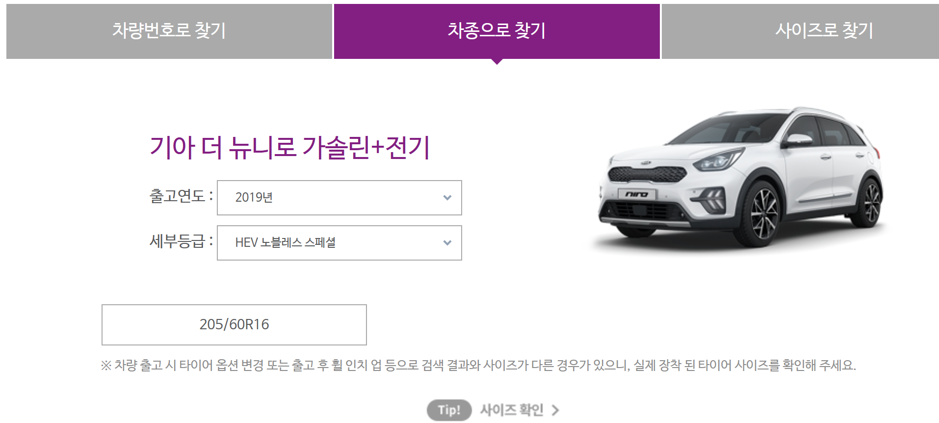 이 곳에 내 차량 번호를 넣거나, 차종으로 선택해서 찾으면 아래와 같이 타이어 규격을 알려준다.