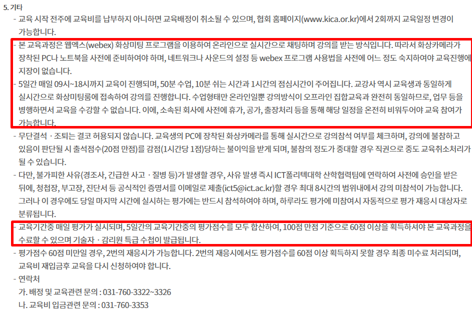 무조건 정독해야하며 명시된 기한까지 테스트룸에 접속해서 1회이상 테스트를 해달라고 했기 때문에 접속해서 점검하면 된다. 이때 충분히 점검을 해야 실제 교육일에 정상적으로 교육을 수강 받을수 있음.