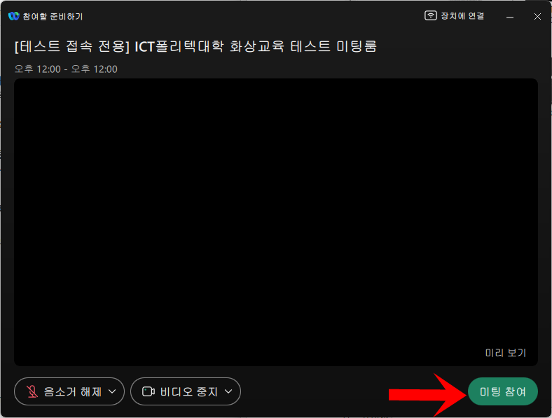 테스트 미팅룸 접속한 화면이며, 교육받을때도 똑같기 때문에 여기서 최대한 테스트 해야 한다.
