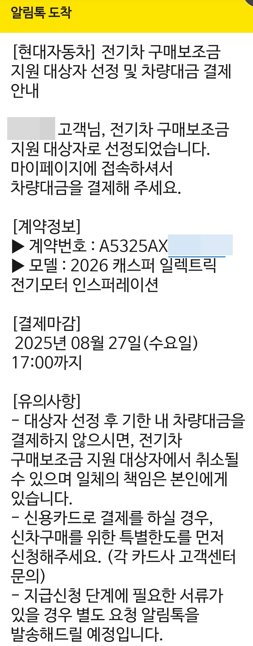 10일 이내 결제요청 예정이라더니, 10일이내 출고라고?? 라고 의문을 갖고 있으니 바로 20분뒤에 현대차에서 알림톡을 보내옴