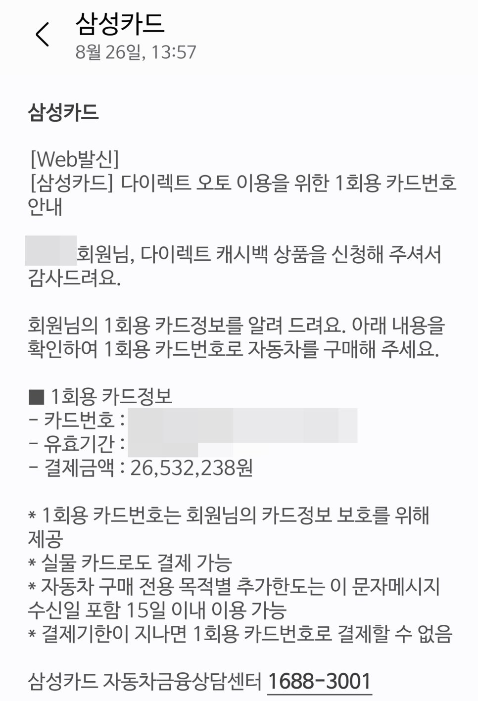 오토캐시백의 경우 신청서를 작성하면 가상계좌를 알려주면서 금액을 입금하라고 나오고 금액을 입금하면 1회용 카드번호와 유효기간을 알려주는 문자가 오는데 이 정보로 결제를 하면 된다.