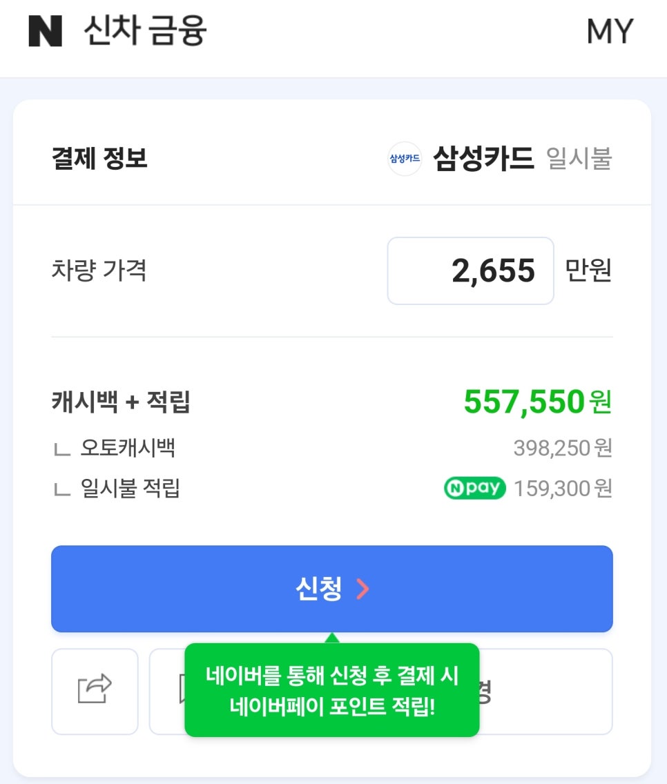 오토캐시백 1.5% + 네이버페이 0.6% 지급으로 약 55만 7550원을 캐시백 받을 수 있었음.