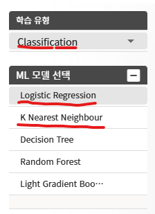 반대로 분류유형에서 선택한 ML모델은 아래와 같이