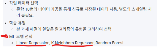 이번 문제는 회귀문제 였던지라, 회귀쪽에서 선택가능한 ML모델중에서 몇개 선택하라고 문제가 나와야 하는데